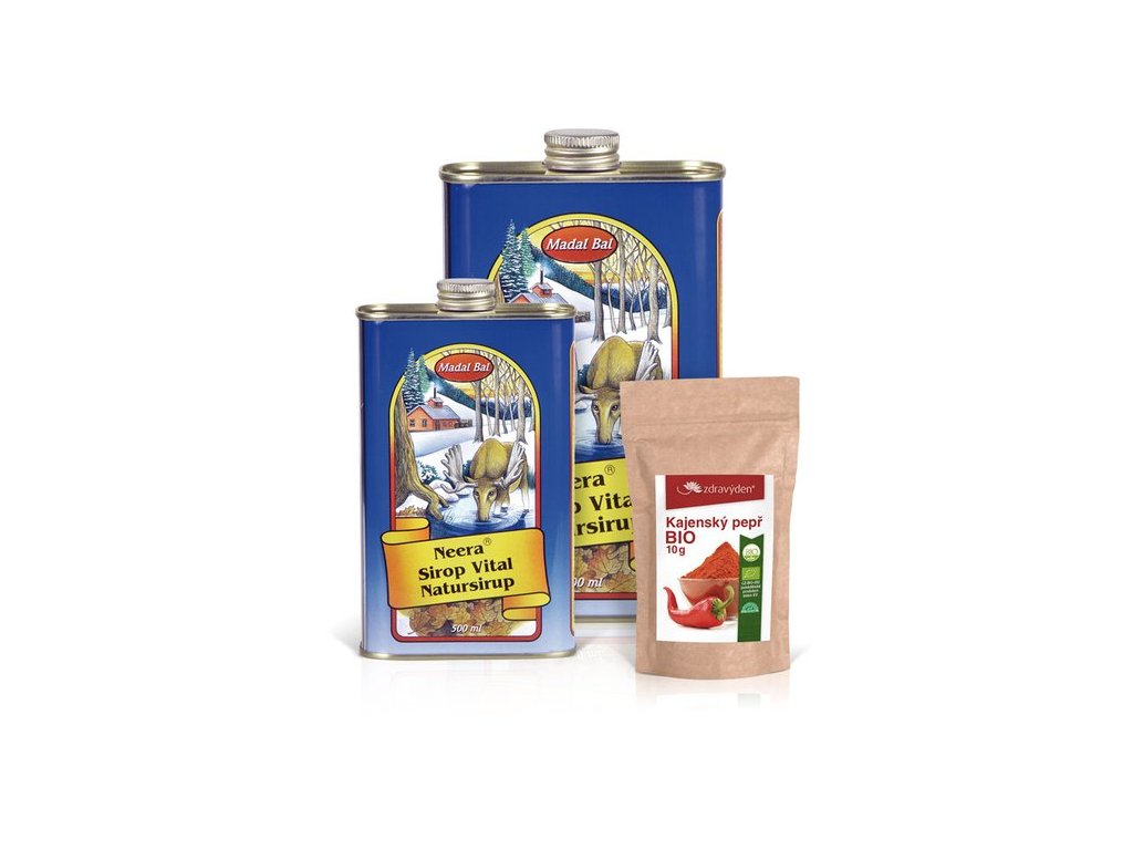 - Neera na třídenní kúru: 0,5l Neera přírodní stromový sirup, Kajenský pepř BIO 10g a leták s podrobným popisem kúry.