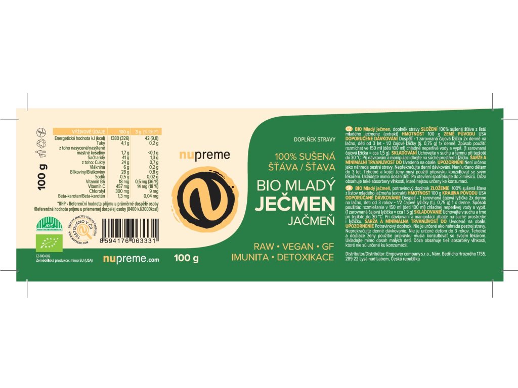 Nupreme BIO Mladý ječmen Premium 100 g DMT: 30.03.2025