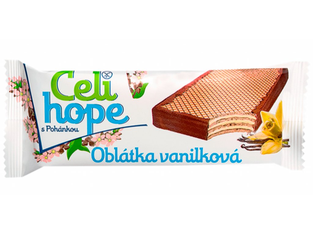 DIA Oplatka s krémovou náplní s fruktózou a vanilkovou příchutí po krajích omáčená kakaovou polevou. Vhodné i pro diabetiky a celiaky.
