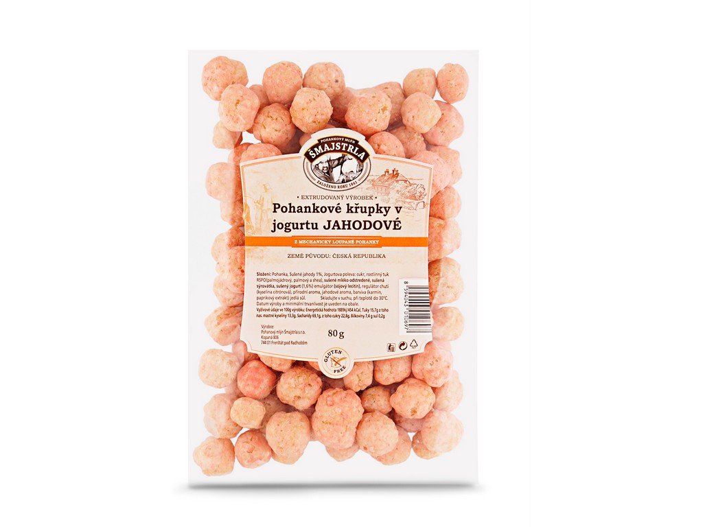 Pohankové křupky obalované v jogrurtové polevě s příchutí jahody jsou vyráběné z České pohanky, kterou zpracováváme v rodinném mlýně ve Frenštátě p. R. Základem je pohanková křupka natural - tedy 100% pohanka, kterou pak obalujeme do jogurtové polevy, do které ještě přidáváme sušené jahody. Je zde ideální poměr polevy a křupky, tak aby chutě byly vyvážené. Tyto křupky jsou bezlepkové, nejen pro bezlepkáře, ale i pro příjemné mlsání, či lehkou svačinku.