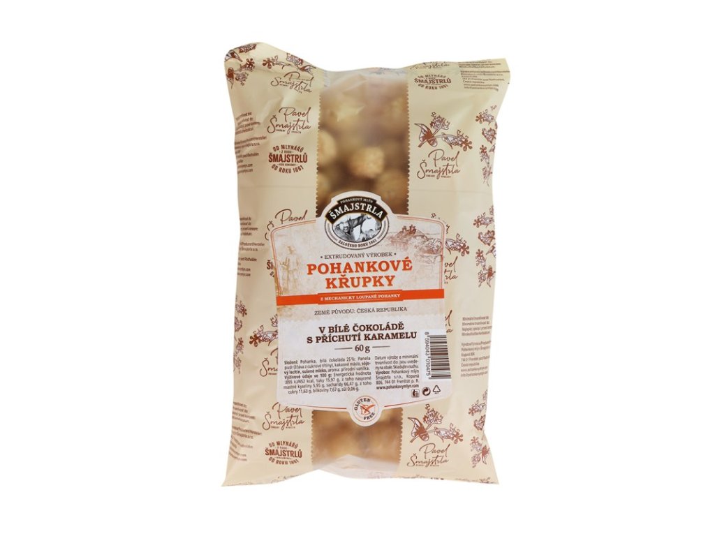 Pohankové křupky v bílé čokoládě a karamelem jsou oblíbenou pochoutkou zejména u dětí. Jsou přirozeně bezlepkové a lehce stravitelné. Vhodná součást k výletům i k večernímu mlsání. Pohankový extrudovaný výrobek.