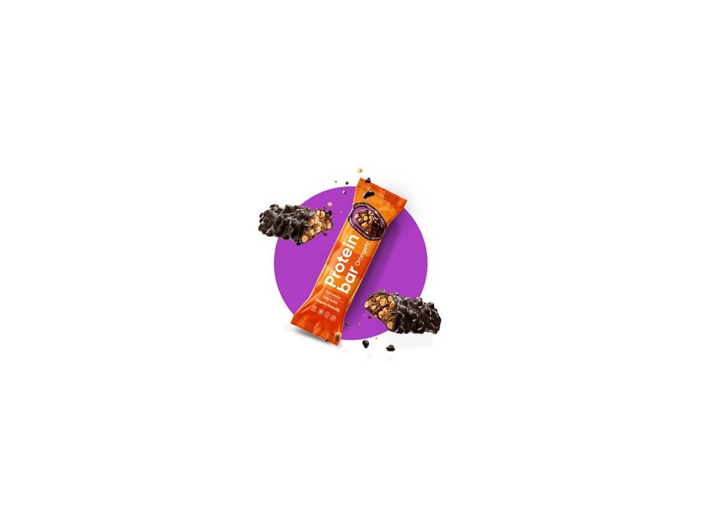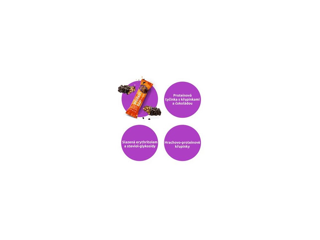 Složení: čokoládová poleva (kakaové máslo, oligofruktóza, bezlepkový ovesný extrakt v prášku, kakao v prášku, emulgátor lecitin), hrachovo-proteinové křupinky (hrachový protein, protein z fava fazole), oligofruktózový sirup, izolát hrachového proteinu, zvlhčující látka glycerol, protein z fava fazole, kakaový prášek, přírodní aroma, akáciová guma, sladidlo steviol-glykosidy.