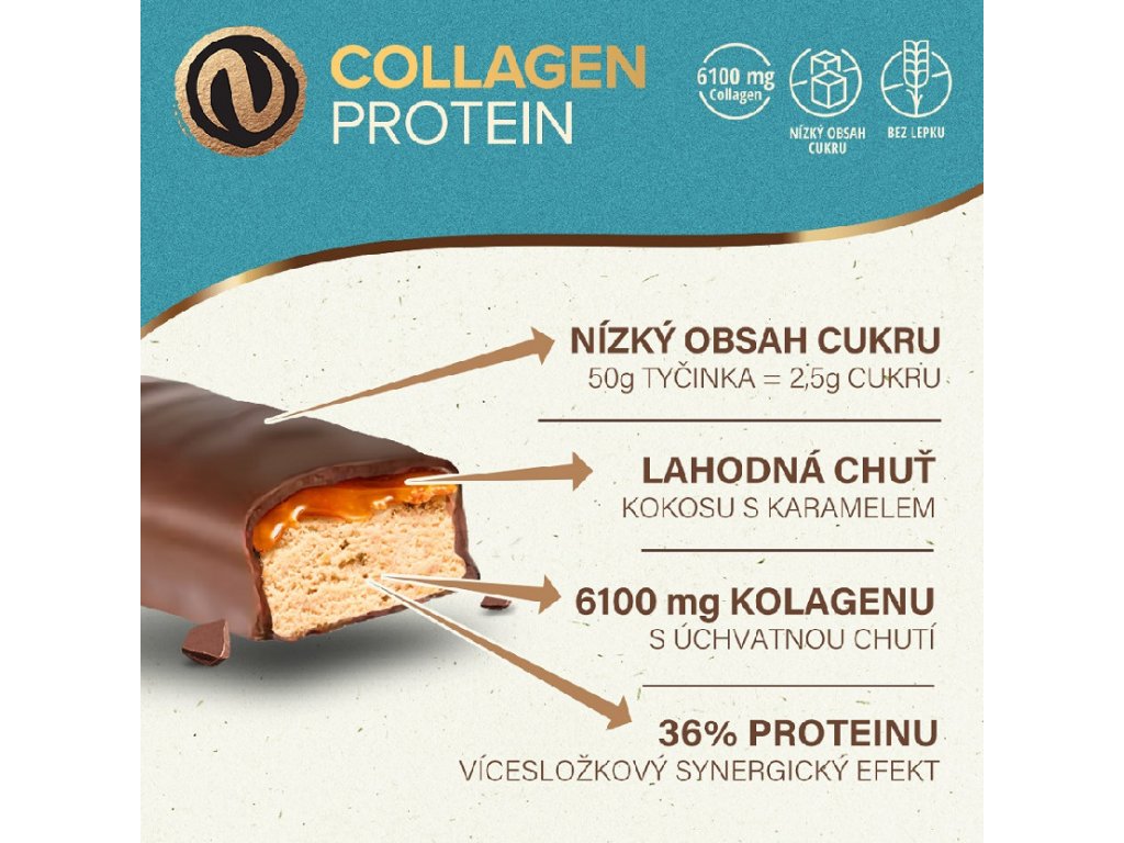 Proteinová tyčinka s kolagenem v oblíbené kombinaci karamel / kokos obsahuje 36% kvalitních bílkovin, z toho více než 6 g tvoří špičkové kolagenové peptidy. Je bezlepková a celá zabalená do lahodné voňavé čokolády s nízkým obsahem cukru. Mlsání bez výčitek, zdravá výživa a praktičnost v jednom balení.