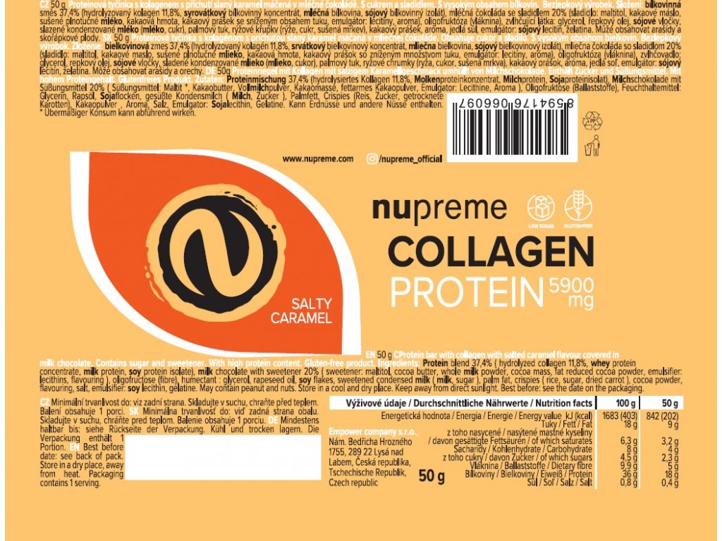 Kolagenová tyčinka Nupreme v sobě spojuje opravdu lahodnou chuť slaného karamelu s voňavou a chutnou čokoládou. Jedna tyčinka obsahuje 18 g proteinu, z toho téměř 6 g tvoří špičkové peptidy kolagenu pro správný beauty efekt. Je navržena tak, aby byla každodenním občerstvením, které potěší chuťové pohárky, dodá energii a poskytne velkou škálu funkčních výhod. To vše při pouhých 2,5 g cukru v jedné tyčince. Kdo chce být ztracen, ať ochutná :-).