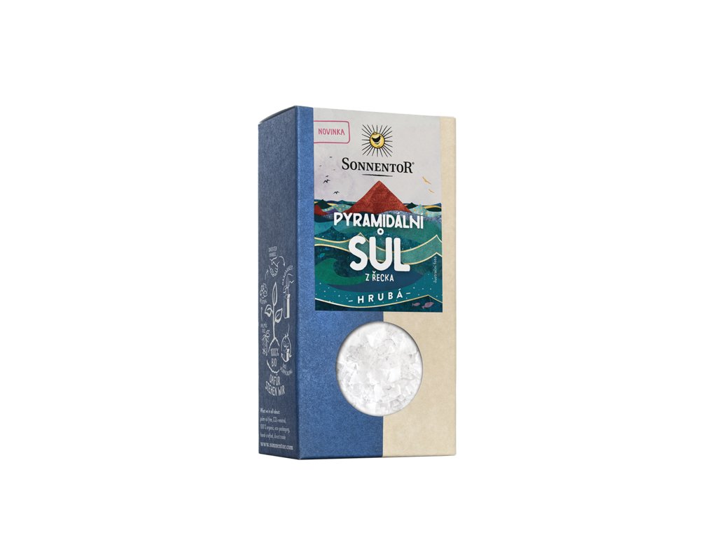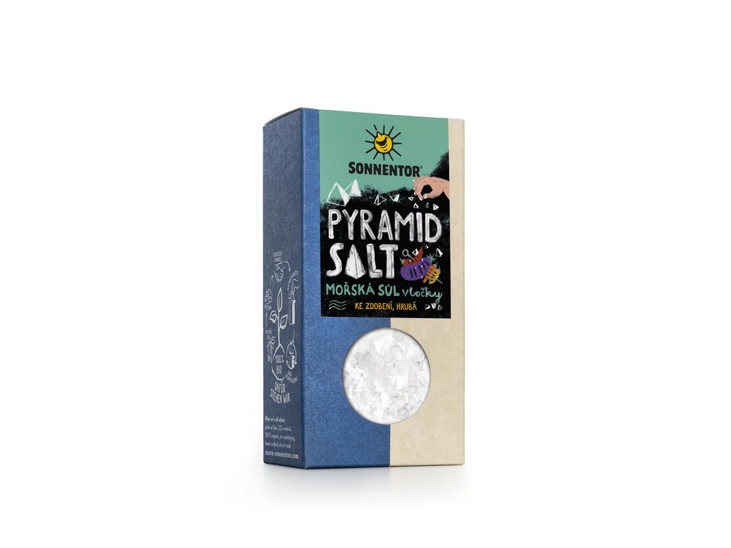 Pyramid Salt 65 g od výrobce Sonnentor. Produkt v bio kvalitě. Pěstováno metodou ekologického zemědělství. Jemně křupavé vločky soli ve tvaru pyramidek dodají šmrnc každému grilovanému pokrmu. Vznikají pomalým zahříváním a následným odpařováním slané mořské vody. Postupně se formující pyramidy mají příjemně slanou chuť. Tip: Křupavé vločky soli na horkém jídle rychle tají. Přidejte je proto nejlépe ke konci vaření na již hotový pokrm, kde jejich krása vynikne. Perfektně se hodí na steak, špízy a vše, co se objeví na grilu. Pyramidální sůl Skladovat v suchu a chladu. Tento produkt neobsahuje žádné alergeny.Doplňkové parametry