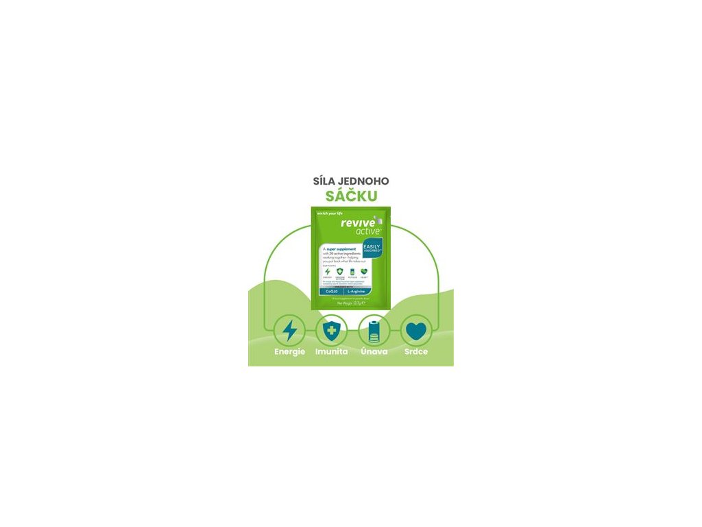Revive Active není další multivitamín, jde o superdoplněk s množstvím účinných látek, které je pro multivitamíny zcela netypické. Revive Active se od jiných produktů odlišuje unikátní a velmi silnou kombinací vitamínů, minerálů a aminokyselin kombinovaných s dalšími složkami jako je koenzym Q10, L-arginin a citrulin. Prášek je snadno rozmíchatelný ve vodě nebo libovolném nápoji. Jeden sáček dodá potřebné mikronutrienty pro celý den. Doplněk je vhodný pro vegany, je kompletně bez lepku a je slazený steviol-glykosidy.