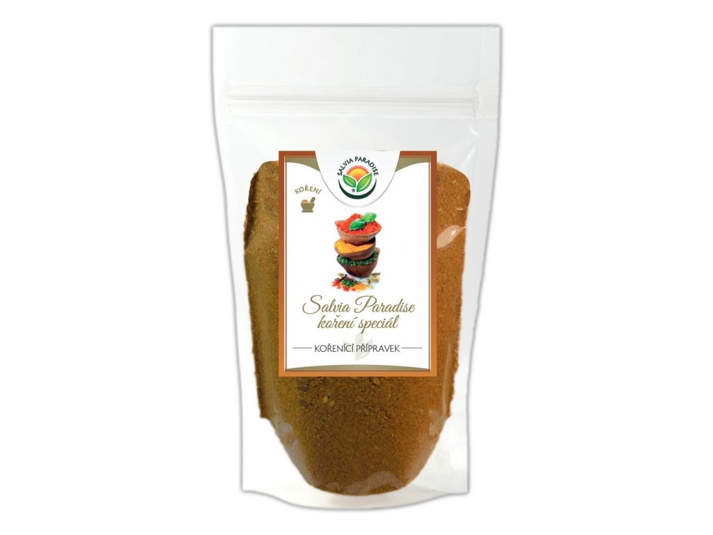 Salvia Paradise koření speciál je kořenicí přípravek té nejvyšší kvality. Speciální směs má velice lákavé hutné aroma. Nabízí se vůně koriandru, česneku a kurkumy. Příjemně slaná chuť je doladěna střídmou pikantností a jiskrou skládající se z chuti všech použitých druhů koření. Vzhledem k obsahu lnu a sezamu můžete po upražení místy očekávat překvapivou chuť oříšků.