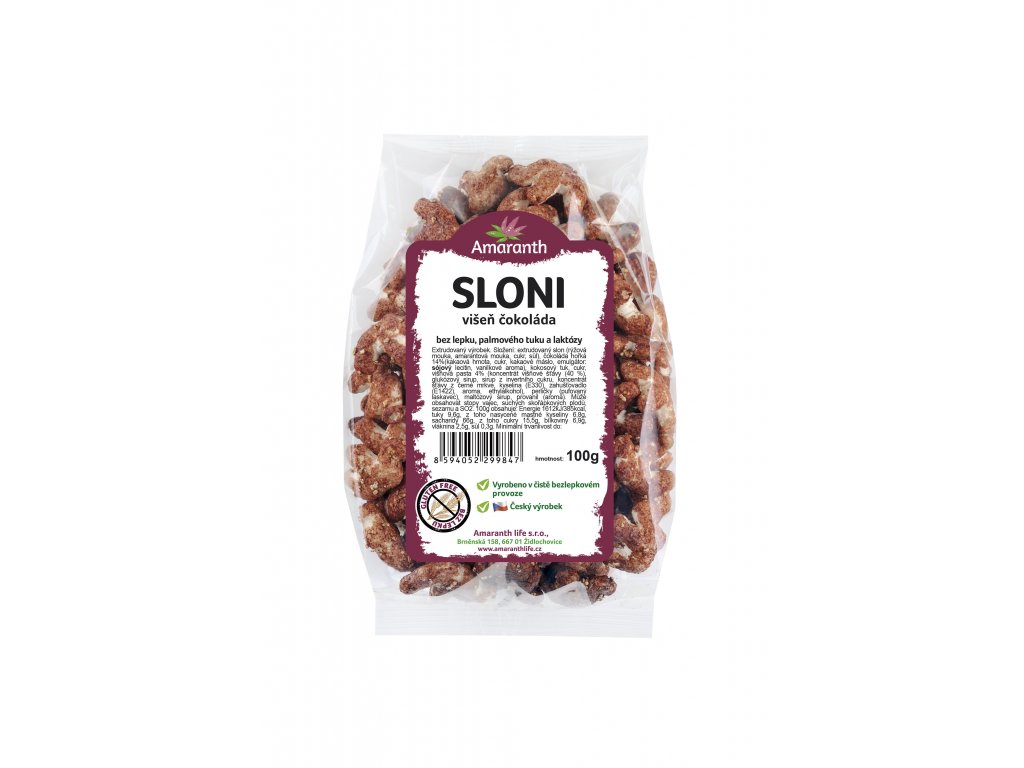 Složení: extrudovaný slon (rýžová mouka, amarantová mouka, cukr, sůl), čokoláda hořká 14% (kakaová hmota, cukr, kakaové máslo, emulgátor: sójový lecitin, vanilkové aroma), kokosový tuk, cukr, višňová pasta 4% (koncentrát višňové šťávy (40 %), glukózový sirup, sirup z invertního cukru, koncentrát šťávy z černé mrkve, kyselina (E330), zahušťovadlo (E1422), aroma, ethylalkohol), perličky (pufovaný laskavec), maltózový sirup, provanil (aroma). Může obsahovat stopy vajec, suchých skořápkových plodů, sezamu a SO2.