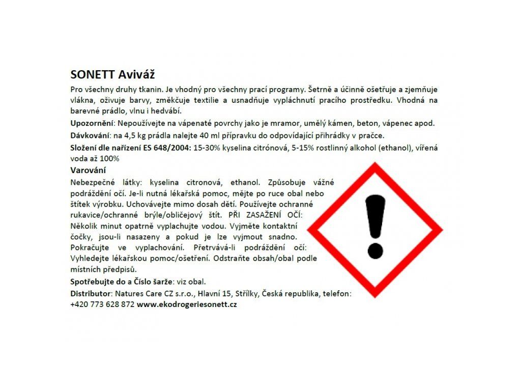 SONETT Aviváž 10 lPro všechny druhy tkanin. Je vhodný pro všechny prací programy. Šetrně a účinně ošetřuje a zjemňuje vlákna, oživuje barvy, změkčuje textilie a usnadňuje vypláchnutí pracího prostředku. Vhodná na barevné prádlo, vlnu i hedvábí. Dávkování: na 4,5 kg prádla nalejte 40 ml přípravku do odpovídající přihrádky v pračce. Varování: Způsobuje vážné podráždění očí. Je-li nutná lékařská pomoc, mějte po ruce obal nebo štítek výrobku. Uchovávejte mimo dosah dětí. Používejte ochranné rukavice/brýle/štít. PŘI ZASAŽENÍ OČÍ: Několik minut opatrně vyplachujte vodou. Vyjměte kontaktní čočky, jsou-li nasazeny a pokud je lze vyjmout snadno. Pokračujte ve vyplachování. Přetrvává-li podráždění očí: Vyhledejte lékařskou pomoc/ošetření. Odstraňte obsah/obal podle místních předpisů. Zvláštnosti produktu Použitá kyselina citronová je v potravinářské kvalitě a má výjimečnou biodegrabilitu. Prací prostředky jsou z drtivé většiny alkalické, použitím kyselé aviváže se praní neutralizuje, což je zvláště vhodné pro alergiky. Původ a vlastnosti jednotlivých složek Kyselina citronová se získává z druhotných produktů cukrového průmyslu, například melasy. Specifické schopnosti kyseliny citronové změkčovat vodu při nízkých teplotách, vyhlazovat vlákna a oživovat jasnost barev z ní činí mimořádně vhodnou složku pro máchání vlněných, hedvábných i jiných druhů tkanin. Alkohol se získává zkvašením rostlinných škrobů. Biologické odbourávání Kyselina citronová je součástí rostlinného, zvířecího i lidského metabolismu a proto je pro mikroorganismy snadné ji rychle a kompletně rozložit na oxid uhličitý a vodu. Celý obal je recyklovatelný Uchovejte v suchu a v uzavřeném obalu. Skladujte mimo dosah dětí. Při náhodném požití vyhledejte lékaře a předložte tento obal. Zásady ekologické drogerie SONETT Výrobky jsou 100% odbouratelné, v řádu hodin až dní se ve vodě zcela rozloží na běžné přírodní složky. Sonett odmítá používat přísady škodlivé pro životní prostředí a pro zdraví člověka. Suroviny použité při výrobě pocházejí z bio-dynamického nebo ekologického zemědělství nebo volného sběru Voda použitá při výrobě je bio-dynamicky rytmizována a do produktů Sonett jsou přidávány směsi energeticky silných bylin a esence drahých kamenů a kovů Sonett je jako jediný výrobce ekodrogerie držitelem dvou ekocertifikátů. Technické údaje: Hustota: (20°C) cca. 1,07 g/cm³ Hodnota pH: (20°C, 5g/l H₂O) cca. 3-4<h2>Složení </H2><br /><P>INCI: Aqua, citric acid, alcohol</P></BODY>Doplňkové parametry