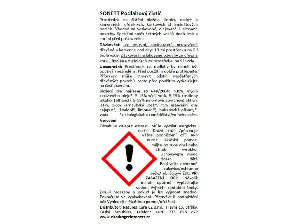 SONETT Podlahový čistič 500 ml Prostředek na čištění dlaždic, linoleí, parket a kamenných, dřevěných, korkových či laminátových podlah. Vhodný na voskované, olejované i lakované povrchy. Speciální směs šetrných vosků dodá lesk a chrání před poškozením. Dávkování: 5 ml prostředku na podlahy na 5 l teplé vody. Před prvním použitím odstraňte bezpečnostní fólii. Upozornění: Prostředek na podlahy by neměl být používán nezředěný. Před použitím dobře protřepejte. Přípravek může ztmavit odstín neošetřených dřevěných povrchů, proto před použitím vyzkoušejte na části povrchu. Celý obal je recyklovatelný Zásady ekologické drogerie SONETT Výrobky jsou 100% odbouratelné, v řádu hodin až dní se ve vodě zcela rozloží na běžné přírodní složky. Sonett odmítá používat přísady škodlivé pro životní prostředí a pro zdraví člověka. Suroviny použité při výrobě pocházejí z bio-dynamického nebo ekologického zemědělství nebo volného sběru. Voda použitá při výrobě je bio-dynamicky rytmizována a do produktů Sonett jsou přidávány směsi energeticky silných bylin a esence drahých kamenů a kovů. Sonett je jako jediný výrobce ekodrogerie držitelem dvou ekocertifikátů. Technické údaje: Hustota: (20°C) cca. 0,99 g/cm³ Hodnota pH: (20°C, 20 ml/10 l H₂O) cca. 7-8<h2>Složení </H2><br /><P>INCI: >30% mýdlo z olivového oleje*, včelí vosk 5-15%, rostlinný alkohol (ethanol) 5-15%, neiontové povrchově aktivní látky 5–15% karnaubský vosk* 1–5%, esenciální olej cajeput* (linalool*, cajeput*) <1%, balzamické přísady*, voda. * Z ekologického zemědělství/volného sběru. Seznam složek podle ES 648/2004: Aqua, Potassium Soap*, Cera Alba, Alcohol denat., Alkylpolyglucoside C8-C16 (Coco Glucoside), Copernicia Cerifera*, Parfum*, Linalool*, Limonene* </P></BODY>Doplňkové parametry