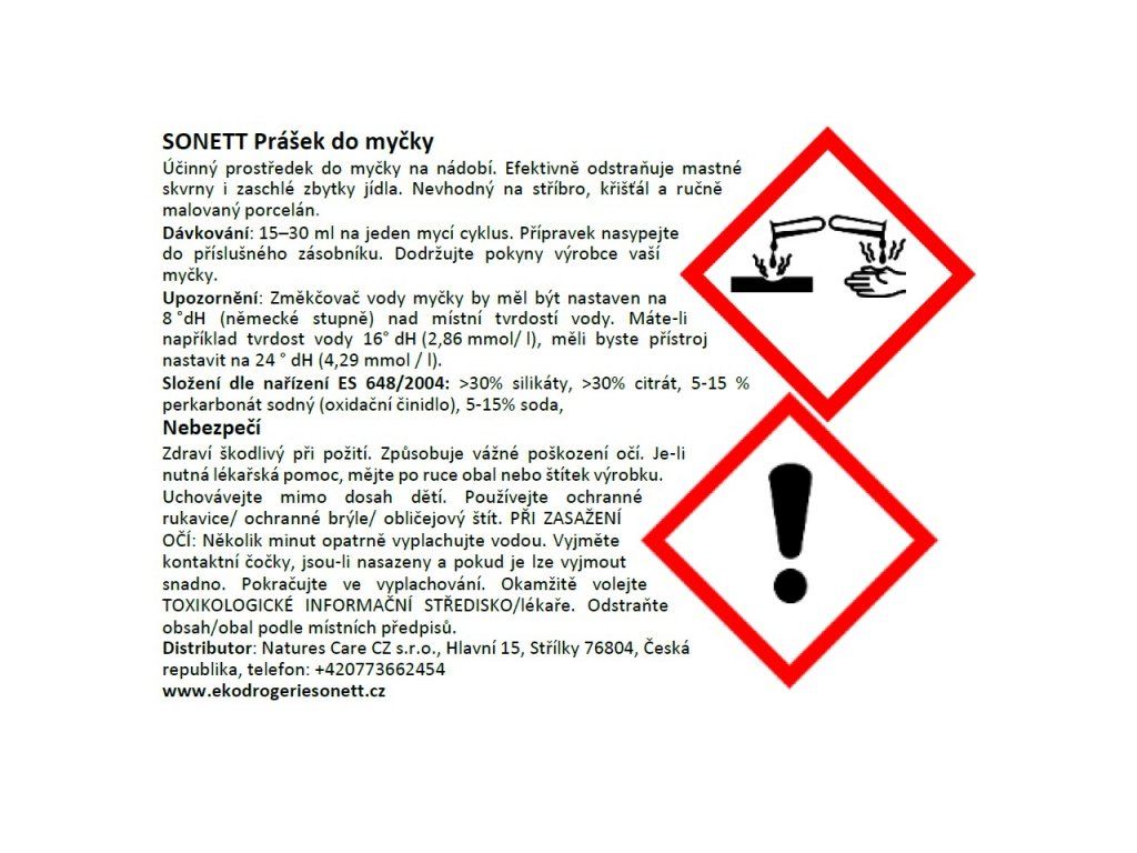 SONETT Prášek do myčky 3 kgÚčinný prostředek do myčky na nádobí. Efektivně odstraňuje mastné skvrny i zaschlé zbytky jídla. Nevhodný na stříbro, olovnatý křišťál a ručně malovaný porcelán. Důležité upozornění: Vhodné pouze pro myčky nádobí s nastavitelným změkčením vody. Pokud stroj neumožňuje ruční nastavení, není možné používat Sonett mycí prostředky do myček.Komory pro regeneraci, sůl a leštidlo by měly být vždy naplněny a jemný filtr myčky by měl být pravidelně čištěn.Dávkování: 15 - 30 ml na jeden mycí cyklus. Přípravek nasypejte do příslušného zásobníku. Dodržujte pokyny výrobce vaší myčky. Změkčovač vody myčky by měl být nastaven na 8 ° dH (německé stupně) nad místní tvrdostí vody. Máte-li například tvrdost vody 16 ° dH (2,86 mmol / l), měli byste přístroj nastavit na 24 ° dH (4,29 mmol / l). SONETT TIP: Nejefektivnějšího ekologického mytí v myčce pro lesklé a čisté nádobí dosáhnete při současném použití Sonett prášku do myčky, Sonett leštidla a Sonett regenerační soli. Pozor: V případě zabudovaného elektronického změkčovače vody, není vhodné používat Sonett ekologické mycí prostředky. Zvláštnosti produktu U tohoto produktu nepoužíváme agresivní bělicí prostředky s obsahem chloru, fosfáty, syntetické prostředky na ochranu stříbra, enzymy atd. Přesto tento čisticí prostředek zvládne výtečně i silné znečištění. Původ a vlastnosti jednotlivých složek Silikáty se získávají roztavením písku se sodou a jsou díky své alkalitě schopny tuk na nádobí zmýdelnatěním přeměnit a zajistit jeho vodorozpustnost. Ulpívající zbytky jídla se pomocí těchto silikátů rozmočí a uvolní. Soda vyráběná z kuchyňské soli a vápna, rozptyluje tuk na jemné kapénky, a podporuje tak schopnost silikátů rozpouštět tuk. Citrát, získávaný při fermentaci vedlejší produktů výroby cukru jako např. melasy, se do čisticího prostředku do myčky na nádobí přidává proto, aby poutal vápník v mycí vodě a chránil myčku před jeho usazeninami; je totiž známo, že mnohé myčky i přes zabudovaný iontový výměník (zařízení na změkčování vody) vodu nedostatečně změkčují. Biologické odbourávání Mýdlo ztrácí okamžitě po použití, v bezprostřední reakci s vápníkem obsaženým vždy v odpadní vodě, své vlastností snižující povrchové napětí (primární odbourávání). Vápenaté mýdlo je následně ze 100 % rozkládáno na oxid uhličitý a vodu (sekundární odbourávání). Cukrové smáčedlo a deriváty kokosového oleje jsou získávány chemickou konverzí pomocí kyselin ze surových materiálů čistě rostlinného původu a kompletně si zachovávají svou přirozenou strukturu. Pro mikroorganismy je proto snadné je kompletně rozložit. Etanol je do přírodního cyklu navrácen během několika hodin. Upozornění: Pro dokonalý účinek je nutné pravidelně používat leštidlo a regenerační sůl do myčky SONETT. Celý obal je recyklovatelný Zásady ekologické drogerie SONETT Výrobky jsou 100% odbouratelné, v řádu hodin až dní se ve vodě zcela rozloží na běžné přírodní složky. Sonett odmítá používat přísady škodlivé pro životní prostředí a pro zdraví člověka. Suroviny použité při výrobě pocházejí z bio-dynamického nebo ekologického zemědělství nebo volného sběru Voda použitá při výrobě je bio-dynamicky rytmizována a do produktů Sonett jsou přidávány směsi energeticky silných bylin a esence drahých kamenů a kovů Sonett je jako jediný výrobce ekodrogerie držitelem dvou ekocertifikátů. Technické údaje: Hustota: (20°C) cca. 0,98 g/cm³ Hodnota pH: (20°C, 5 g/l H₂O) cca. 10-11<h2>Složení</H2><br /><P>INCI: Sodium silicate, sodium citrate, sodium percarbonate, sodium carbonate, sodium metasilicate </P><br /><P></P></BODY>Doplňkové parametry