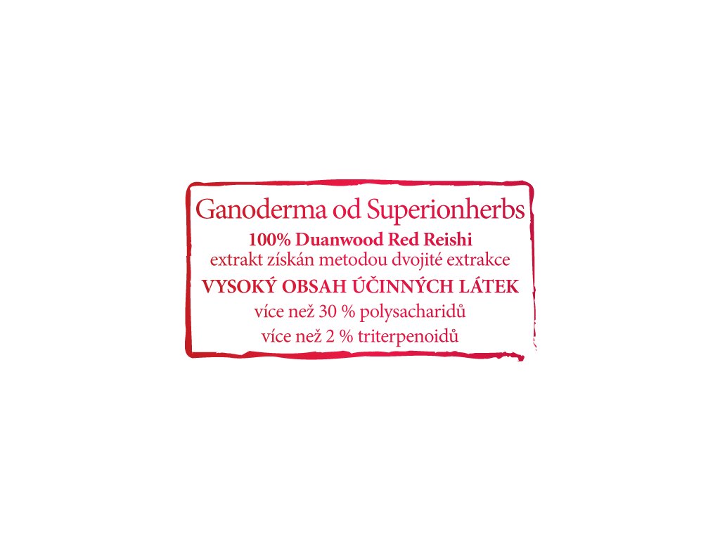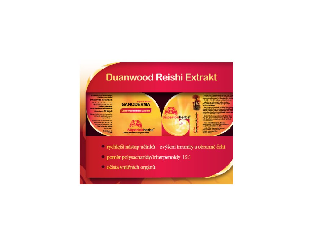 Duanwood Red Reishi Extrakt Superionherbs je složen z výtažků houby reishi, která je nazývána “houbou nesmrtelnosti” a je jednou z nejcennějších a nejvyhledávanějších rostlin. Produkt je unikátní tím, že obsahuje více než 40 % polysacharidů a více než 4% triterpenoidů, což zajišťuje velmi vysokou účinnost produktu. Vysokého obsahu polysacharidů a triterpenoidů bylo dosaženou metodou dvojité extrakce.