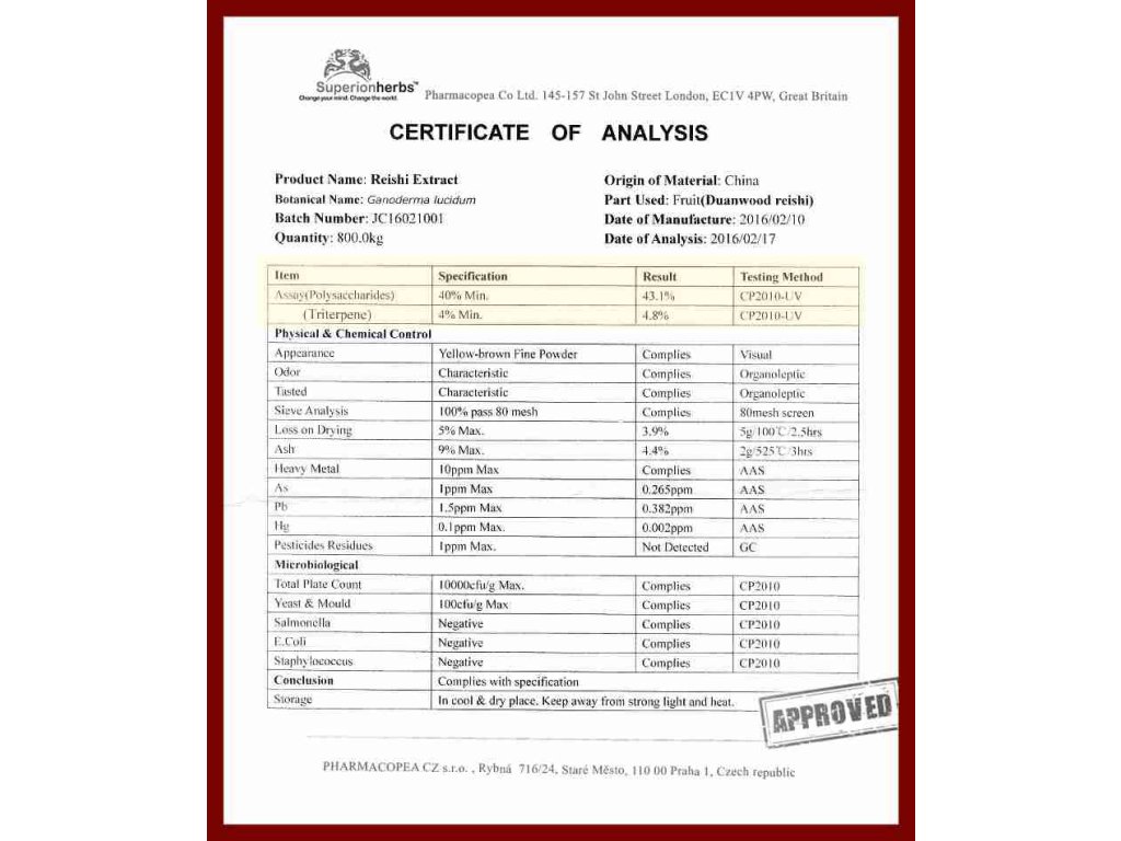 - na všechny produkty jsou prováděny v renomované a nezávislé laboratoři testy na těžké kovy, pesticidy, mikrobiologické testy, DNA, testy na radioaktivitu, množství polysacharidů
