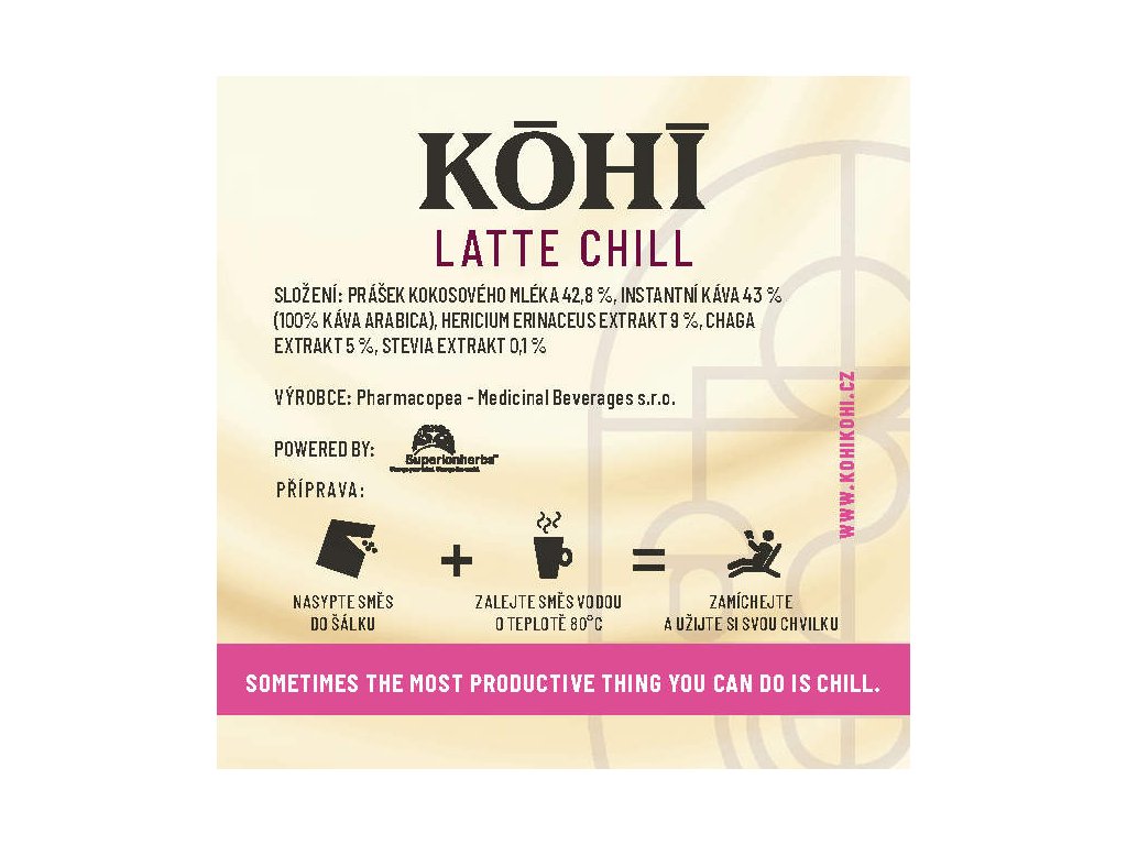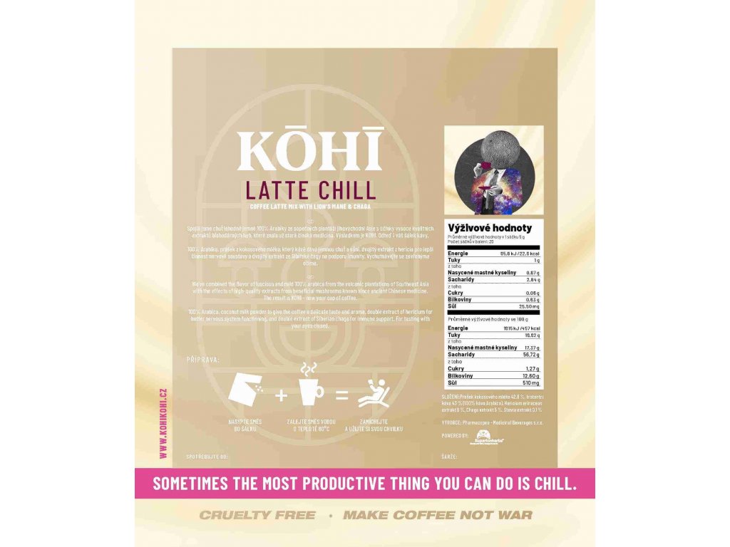 Tato jedinečná káva nabízí vysoký podíl funkčních extraktů, aniž by to ovlivnilo excelentní chuť a sílu kávy. Kohi - latte obsahuje čistou 100% Arabiku a je obohacen dvojitým extraktem z hericia, který podporuje činnost nervové soustavy. Dále obsahuje dvojitý extrakt ze Sibiřské čagy, který posiluje imunitní systém, a kokosový mléko v prášku, bohaté na zdravé tuky, které přidávají na krémovejší konzistenci. S každým douškem Kohi - latte si nejen užijete výtečnou chuť jemné arabiky, ale také dopřejete svému tělu potřebné látky pro podporu nervové soustavy, imunity a kvalitní tuky pro energii. Vaše šálek kávy teď nabízí více než jenom chuť – nabízí chutnou a prospěšnou zkušenost.