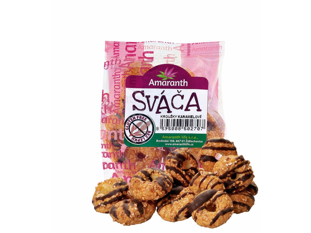 Cereální křehký kroužek karamelové barvy, na povrchu s pufovaným laskavcem a ozdobený proužky tmavé polevy. Trvanlivé pečivo. Extrudovaný výrobek.