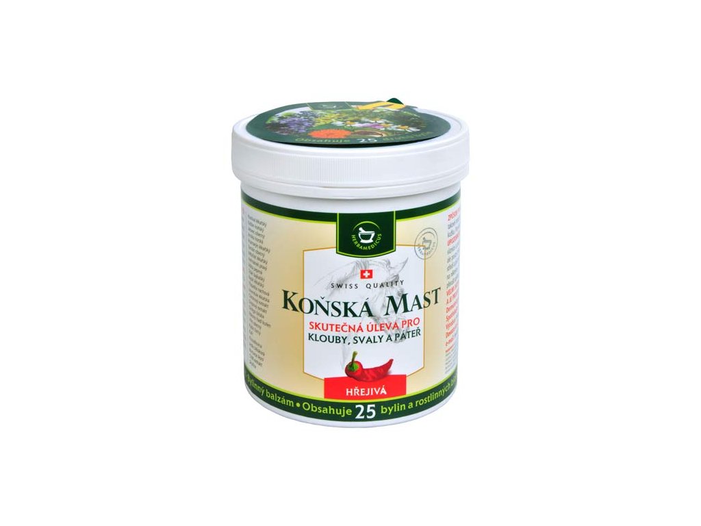 Koňská mast je unikátní bylinný balzám vyrobený z 25 druhů bylinných a rostlinných extraktů podle tradiční, generacemi prověřené receptury. Vyvážený obsah těchto substancí zaručuje široký a silný účinek. Kombinuje uvolňující účinky silic s příznivým působením extraktů z bylin. Některé z těchto bylinných extraktů obsahují látky, o kterých je známo, že ulevují při bolestech kloubů, svalů a páteře.
