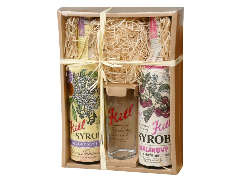 Dárkové balení 2x 500 ml - Kitl Syrob Bezový a Kitl Syrob Malinový + Kitl sklenička 200 ml zdarma. Papírová krabička z hnědé lepenky je vystlána dřevitou vlnou, zabalená v průhledné folii a ozdobená lýkem.