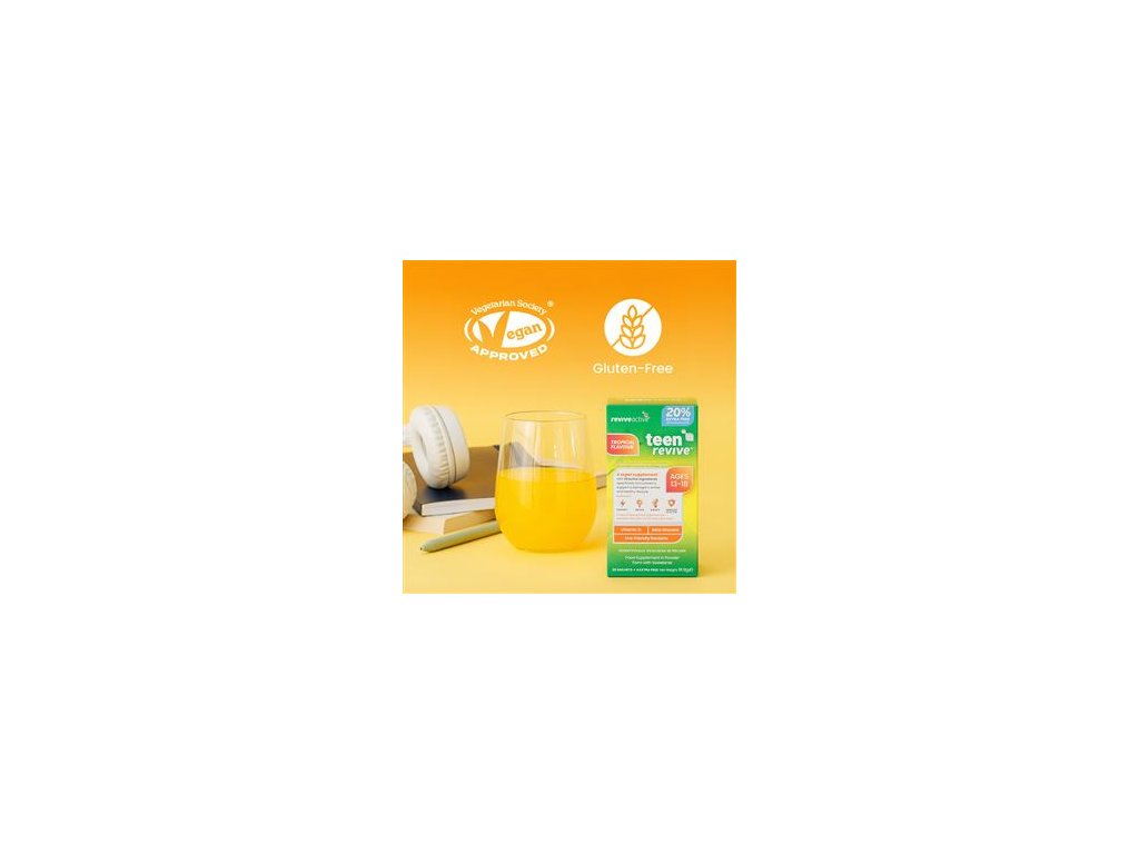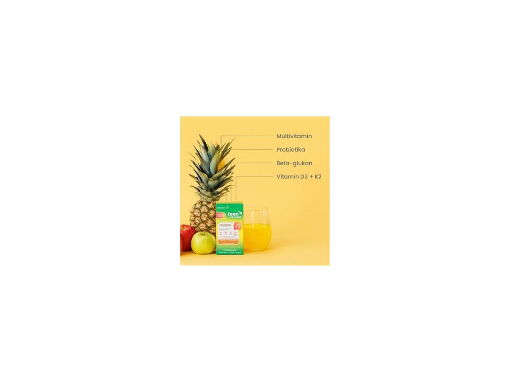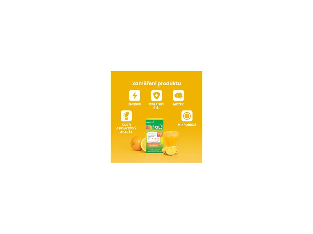 | TEEN REVIVE Doplněk stravy, se sladidlem (steviol-glykosidy). Superdoplněk stravy pro dospívající ve věku 13-18 let (vitalita, energie a obranný štít) s obsahem osmi přesně cílených složek pečlivě vybraných od prověřených a celosvětově uznávaných producentů.