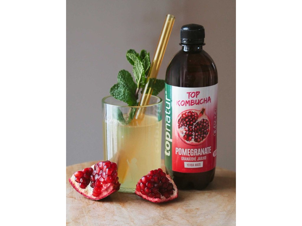 TOP Kombucha Granátové jablko vzniká tradiční fermentací nálevu z BIO Yerba Maté a třtinového cukru za pomoci kombuchových kultur (kvasinky a bakterie mléčného kvašení). Díky dvojité fermentaci je nápoj přirozeně jemně perlivý a obsahuje živé kultury, které podporují střevní mikrobiom a trávení.