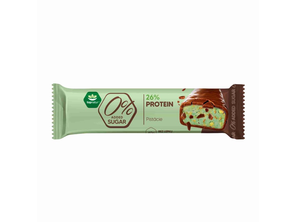 Směs proteinů 28 % (SYROVÁTKOVÝ bílkovinový koncentrát, SÓJOVÝ bílkovinový izolát, MLÉČNÁ bílkovina), FOS (rozpustná vláknina), hořká čokoláda se sladidlem 18 % (kakaová hmota, sladidlo: maltitol, kakaové máslo, emulgátory: slunečnicový lecitin a E476, aroma), pitná voda, řepkový olej, MANDLOVÁ mouka, PISTÁCIE 3 %, emulgátor: SÓJOVÝ lecitin, aroma, barvivo: chlorofyl.