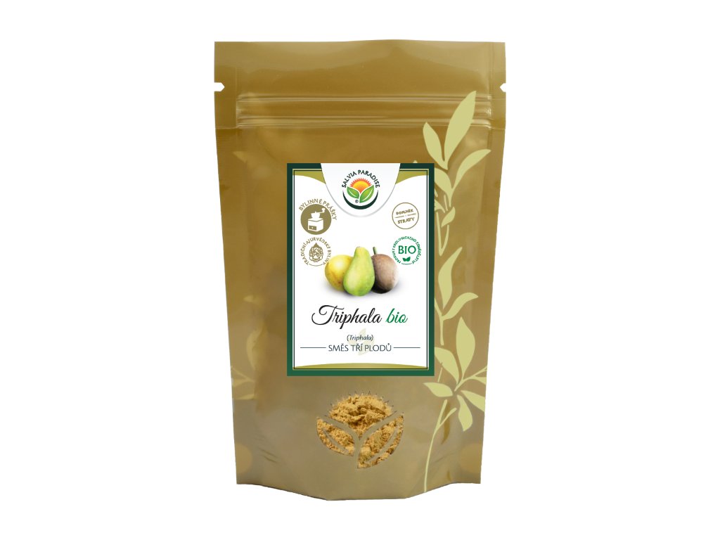 Triphala BIO je tradiční kombinace plodů tří rostlin staré indické medicíny – ájurvédy. Obsahuje plody amalaki BIO, haritaki BIO a vibhitaki BIO. Vyvážená směs těchto plodů působí jako očistný prostředek s blahodárným vlivem na trávení a imunitní systém. Plody haritaki a vibhitaki mají antioxidační vlastnosti a jejich široké působení ovlivňuje kardiovaskulární zdraví, hladinu cholesterolu a cukru v krvi, játra a respirační zdraví. Haritaki přispívá k podpoře reprodukčního systému a zdravé pleti.