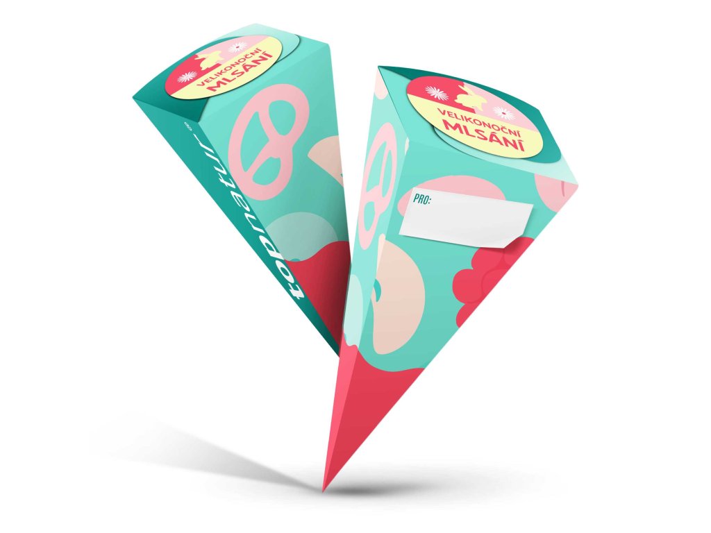 Velikonoční kornout je praktická a elegantní sladká nadílka vhodná jako dárek pro rodinu, přátele, kolegy i koledníky. Pečlivě vybraná kombinace pochoutek spojuje několik výrazných chutí – křupavé solené preclíky v hořké čokoládě, jemné mandle obalené v bílé čokoládě s karamelem a ovocné lyofilizované maliny v bílé čokoládě se sladidlem.
