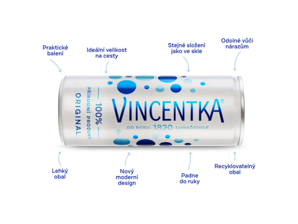 Minerální voda Vincentka v plechovce. Tato přírodní minerálka vyvěrá v oblasti města Luhačovice, kde se stala základem lázeňské péče, a je používána k pitným a inhalačním kúrám. Jedná se o silně mineralizovanou, jodovou, uhličitou minerální vodu hydrogenouhličitano-chlorido-sodného typu, se zvýšeným obsahem fluoridů a kyseliny borité. Je cenným zdrojem jódu a dalších důležitých minerálů. Je přirozeně sycená, hypotonická. Oceníte ji jako přírodní doplněk výživy pro sportovce, děti, těhotné ženy i rekonvalescenty. Pomáhá regenerovat vnitřní prostředí člověka po velkých ztrátách potu například po těžké fyzické práci, sportu, pobytu v horkém prostředí nebo při horečnatých onemocněních. Cenově výhodné balení po 6 kusech.