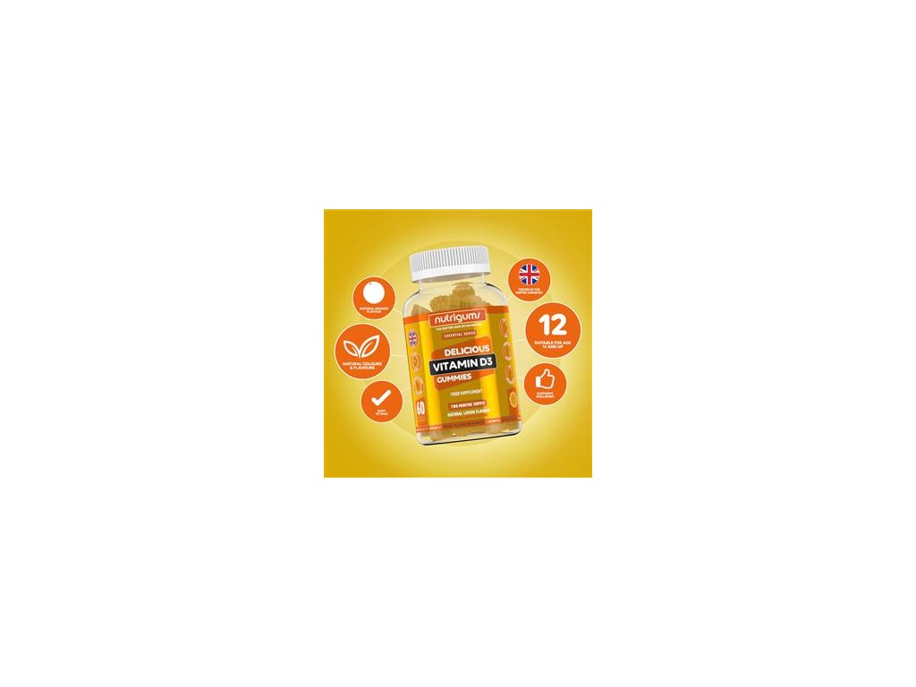 Vitamínová želé nemusí být plná umělých sladidel a barviv! Jde si pochutnat i bez syntetických látek. Želé Nutrigums® Vitamin D3 má lahodnou přírodní citrónovou příchuť a lehce se konzumuje. Tělu dodává všechny benefity vitamínu D - posiluje obranný štít, má vlastnosti související s kostmi, svaly a mikrobiomem. V 1 želé tělu dodáme 25 μg vitamínu D3 (1000 iu) = 500 % RHP.