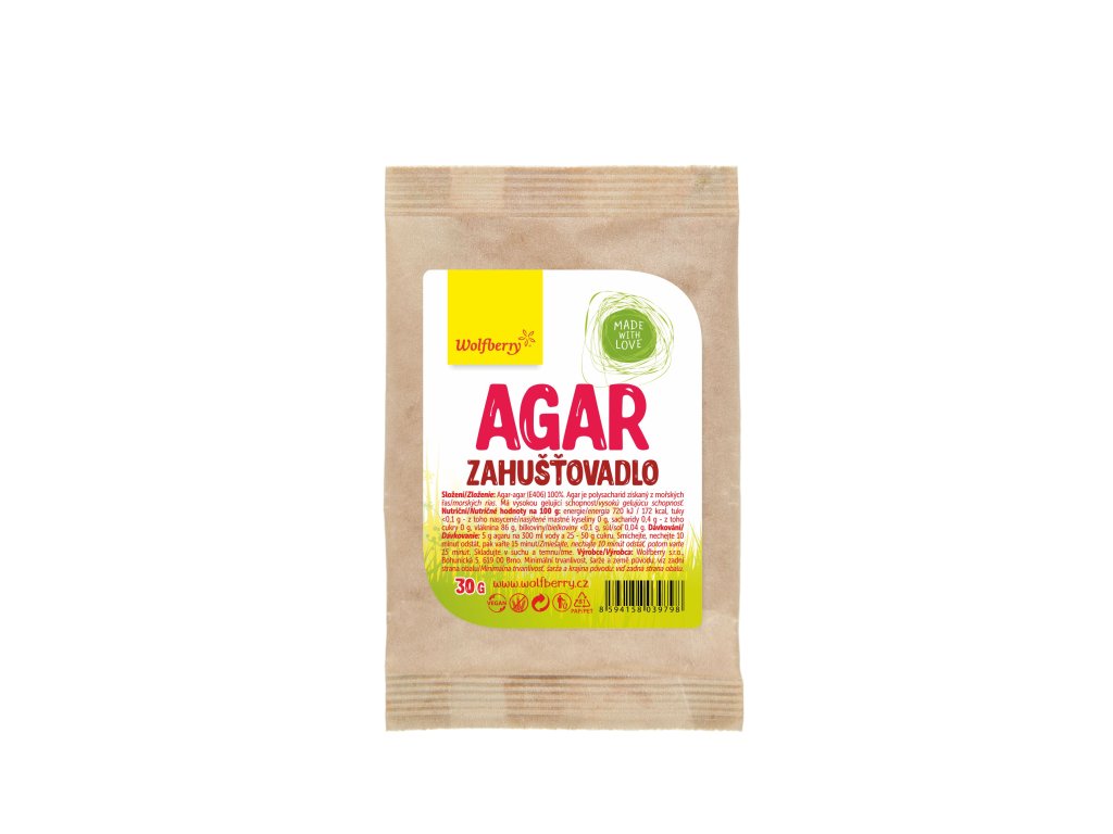 Agar od Wolfberry je výbornou a velice zdravou alternativou želatiny. Přírodní želatinový přípravek se získává z červených mořských řas. Je průhledný, bez chuti a zápachu a zůstává tuhý i za vyšších teplot. Agar je součástí cukrárenských želé. Pomáhá vytvářet tzv. vysoké vrstvy želé, které při krájení dobře drží tvar.