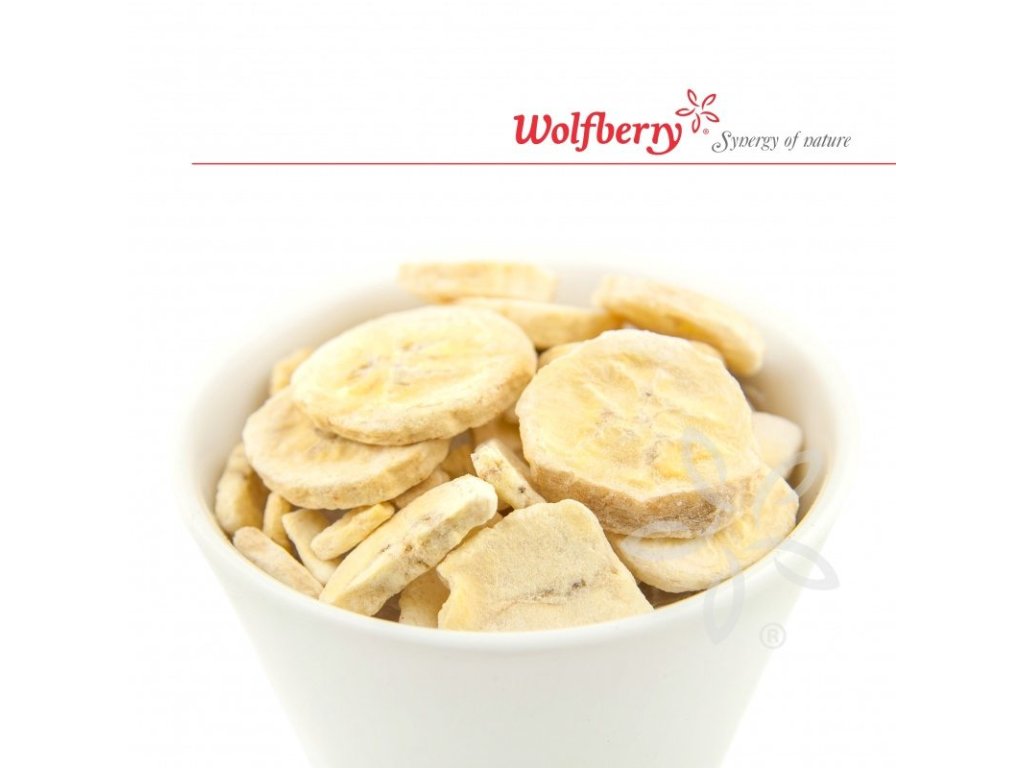 Banány 20g Wolfberry jsou sušené mrazem, což je nejšetrnější postup sušení ovoce. Plátky banánů si tak zachovávají svoji neuvěřitelnou chuť i vůni a kolem 90 % nutričních hodnot čerstvého ovoce. Lze je používat všude tam, kde čerstvé banány.