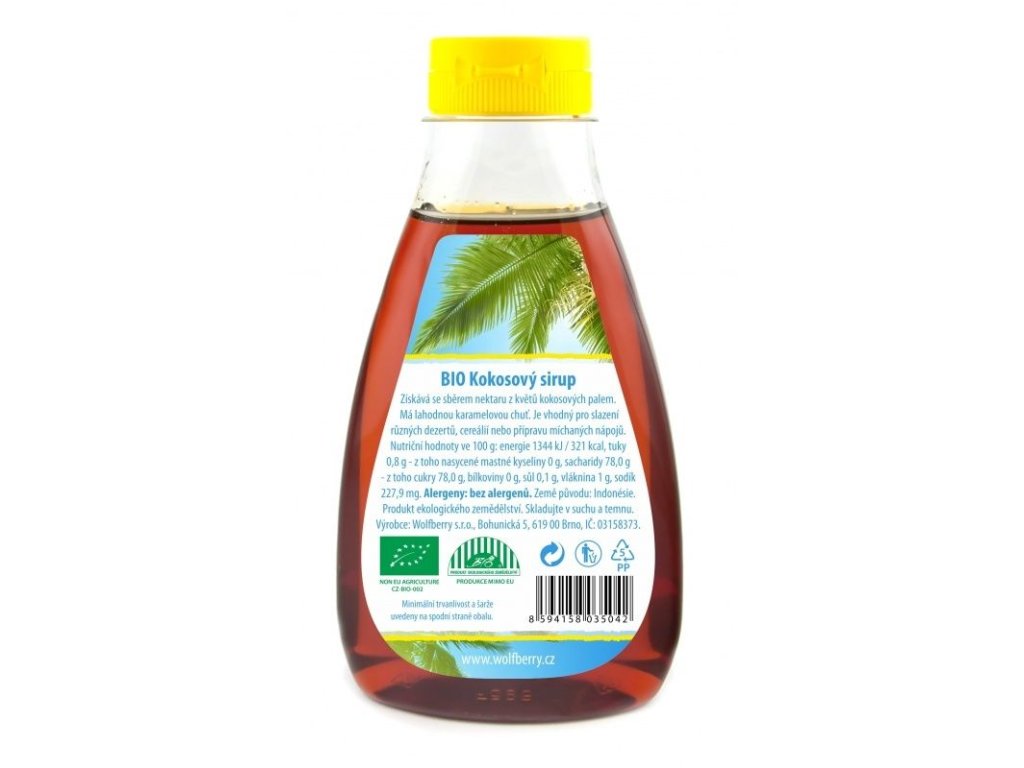 Kokosový sirup Wolfberry BIO se získává z okvětí kokosových palem. Multifunkční sladidlo s nízkým glykemickým indexem. Díky jeho vynikající karamelové příchuti nesmí chybět v žádné domácnosti. BIO Kokosový sirup je ideální alternativou ovocných sirupů a všech druhů cukrů.