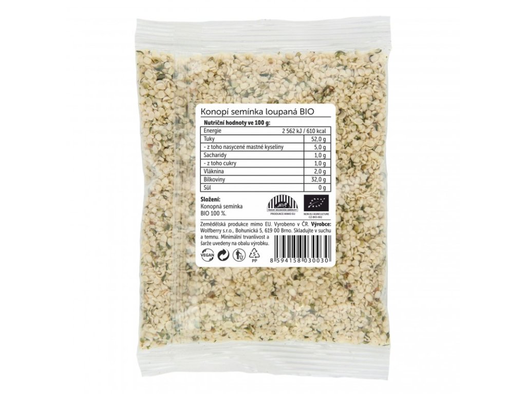 Wolfberry konopná loupaná semínka jsou v BIO kvalitě a vyznačují se extrémní čistotou masy. Běžně se produkují tato semena s nečistotami okolo 0.5 %, zatímco Wolfberry konopná semínka obsahují těchto nečistot pouze 0.1 %. Daleko důležitější je ale fakt, že po vyloupání zůstává normálně v produktu od 2 do 7 % tvrdých slupek, ale Wolfberry garantuje ve svých loupaných konopných semíncích maximálně 0.2 % těchto částic.