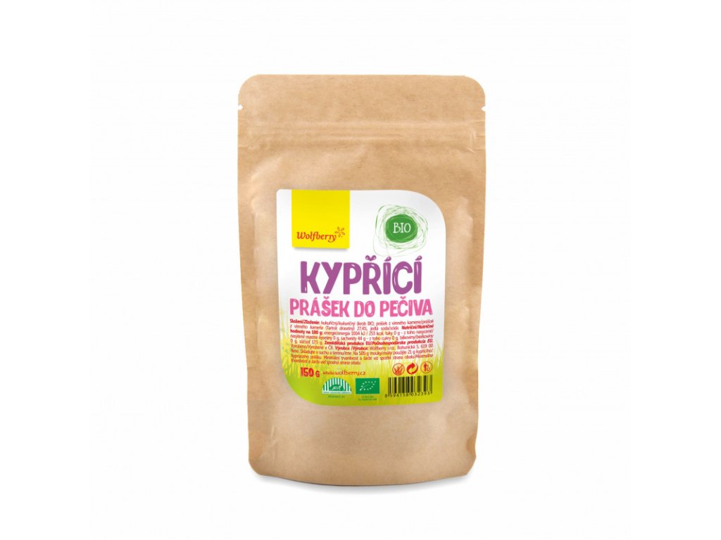 Kypřící prášek do pečiva z vinného kamene BIO 150 g Wolfberry je bezlepková a bezfosfátová příměs, používaná úplně stejně jako běžný kypřící prášek ke zvětšení objemu a odlehčení textury pečiva. BIO kukuřičný škrob je obohacen vinným kamenem a doplněn běžnou jedlou sodou.