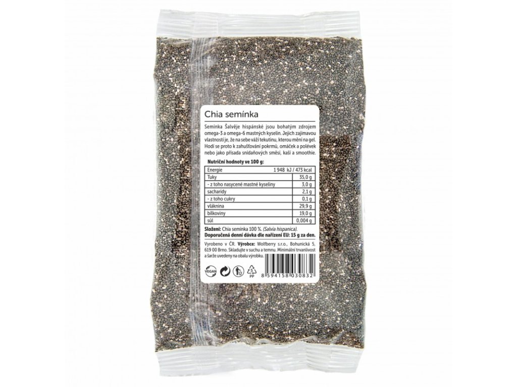 Neobsahuje lepek. Chia se nedoporučuje lidem, kteří mají nízký tlak a dále těm, kteří berou léky na ředění krve a vitamín B17. Nepodávejte dětem do 3 let. Skladujte v suchu a chladu. Země původu: Mexiko