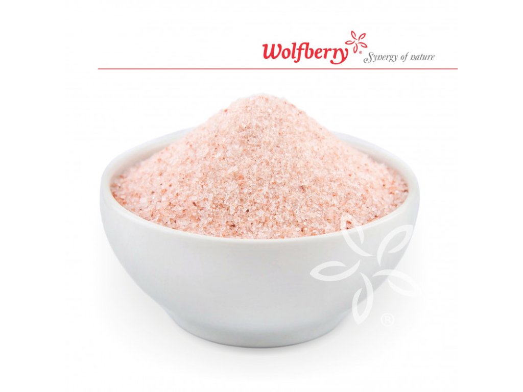 Himalájská sůl růžová Wolfberry. Nerafinovaná přírodní krystalická sůl s obsahem 84 stopových prvků. Bez umělých anorganických aditiv, chemického fluoru a jódu.