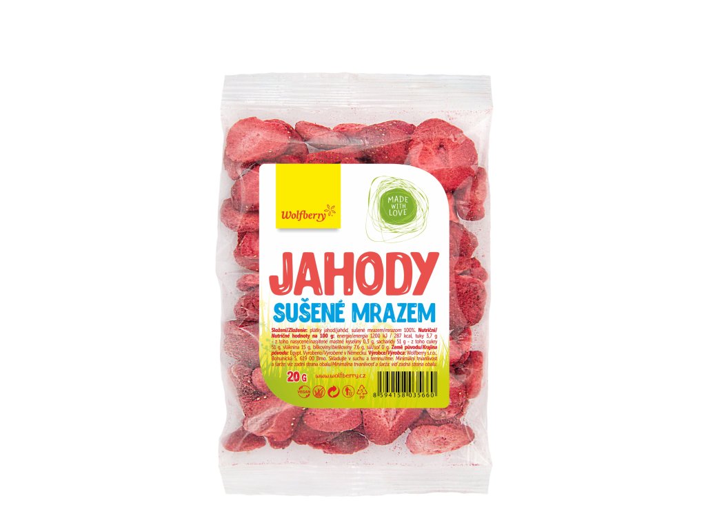 Jahody Wolfberry jsou vynikající jemné, křupavé a voňavé plátky vybraných plodů zralých jahod, které byly po sběru ošetřeny lyofilizací neboli mrazem. Ovoce sušené hlubokým mrazem za velmi nízkého tlaku si zachovává maximum vitamínů, minerálů a dalších nutričních látek, navíc chutná a voní jako čerstvé plody, takže si požitek z jahod můžete dopřávat po celý rok.