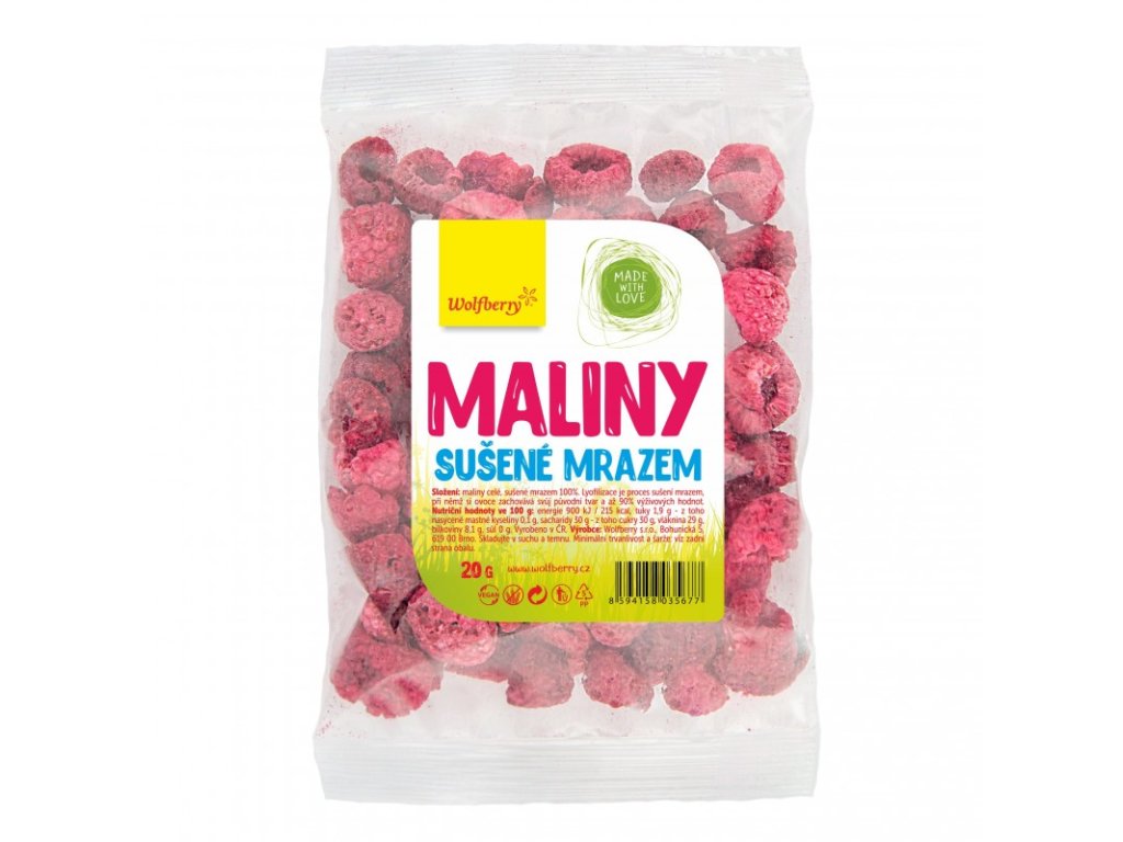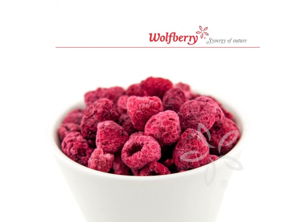 Maliny Wolfberry jsou vynikající jemné, křupavé a voňavé celé plody malin, které byly po sběru ošetřeny lyofilizací neboli mrazem. Ovoce sušené hlubokým mrazem za velmi nízkého tlaku si zachovává maximum vitamínů, minerálů a dalších nutričních látek, navíc chutná a voní jako čerstvé plody, takže si požitek z malin provoněných letním sluncem můžete dopřávat po celý rok.
