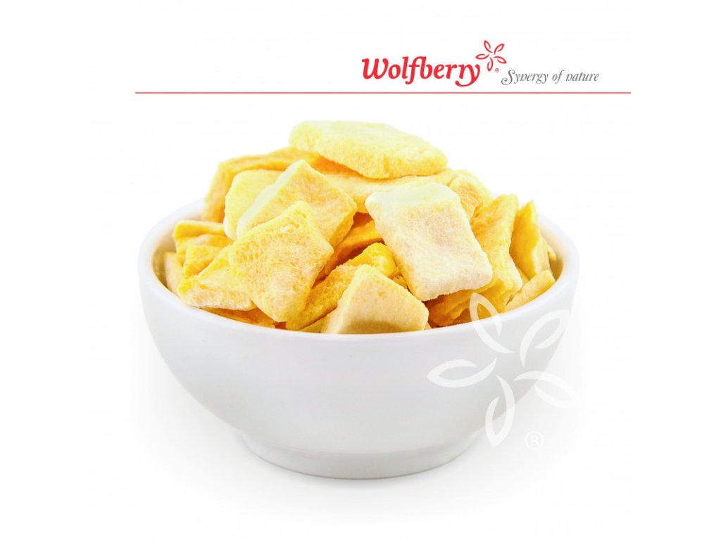 Mango je bohatým zdrojem betakarotenu, vitamínu C a vitaminu A. Jedinečný postup zpracování lyofilizací zachovává ovoci jeho plnohodnotnou chuť, barvu i aroma. Sušené ovoce tím nepřichází o své vitamíny, minerály a další živiny obsažené v čerstvém ovoci. Lyofilizace je proces vysušení a odstranění vody ze suroviny za extrémně nízké teploty a tlaku. Výsledkem je surovina, která je vzhledově velmi podobná té čerstvé, avšak má mnohem nižší hmotnost a dokonale křupavou konzistenci. Z nutričního hlediska je mango zajímavé vysokým obsahem draslíku, vitamínu E a některými vitamíny skupiny B, konkrétně B1, B2, B6 a niacin. Mrazem sušené ovoce je snadno skladovatelné, trvanlivé a lze jej částečně rehydratovat pomocí vody do téměř původního stavu. Pokud si u sušeného manga všimnete bílých skvrnek, nic se neděje. Jde o to, že ovoce často zcukernatí a to se projeví právě takto.